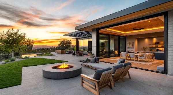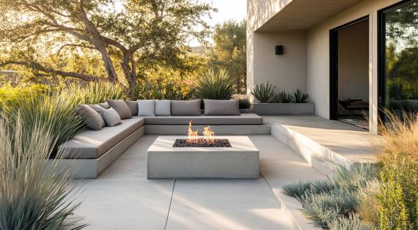 A sleek, square concrete patio extends from your home. A low-profile rectangular firepit made of poured concrete takes center stage. Clean lines and smooth surfaces echo the minimalist aesthetic of modern architecture. Surround the firepit with simple, geometric outdoor furniture in muted tones of grey and white. Matching outdoor pillows add a pop of your favorite color. A few carefully placed, large planters grow architectural foliage like snake plants or succulents. Serene. Uncluttered. Perfect for focusing on what matters — friends and family.