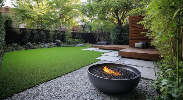 Large, square concrete pavers divide your backyard into a grid. One corner is a modern take on a Zen garden with fine gravel, carefully placed rocks, and lush, green artificial grass. In the zen garden’s center is a round, metal firepit on a slightly raised platform of the same concrete pavers. Sleek, wooden benches surround the firepit, echoing the linear nature of the overall design. The structured hardscaping contrasts beautifully with the organic movement of fire, creating a space perfect for contemplation and relaxation.