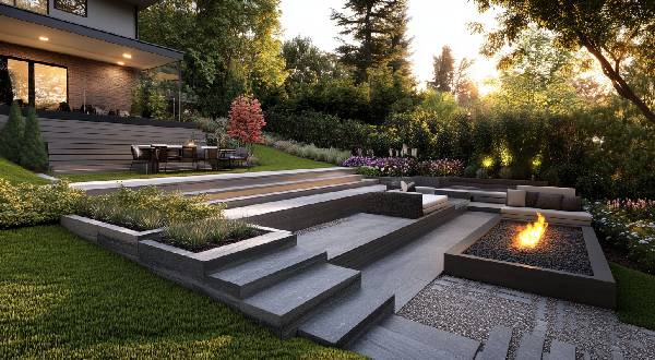 A sloping landscape is accentuated by a tiered backyard firepit design. Each level connects to another by wide, shallow steps. On the middle tier, a long, narrow firepit doubles as a space divider. This linear fire feature is clad in a material that complements your home’s exterior — slate or brushed metal. A modern patio dining area fills one side. The other contains a lounge space with comfortable, contemporary sectional seating. Consistent materials and a monochromatic color scheme unify the entire space. That sloped yard isn’t a bug; it’s a feature.