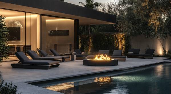 For those lucky enough to have a water pool: a flat, floating platform of concrete extends slightly over the water’s edge. In its center, a round, gas-powered firepit is surrounded by contemporary deck chairs with weather-resistant cushions. The minimal dark gray aluminum of the chairs complements the pale concrete of the platform, creating a cohesive design. Underwater lighting adds drama and complements the fire’s glow, which dances on the water’s surface. Visually stunning and luxuriously tranquil.