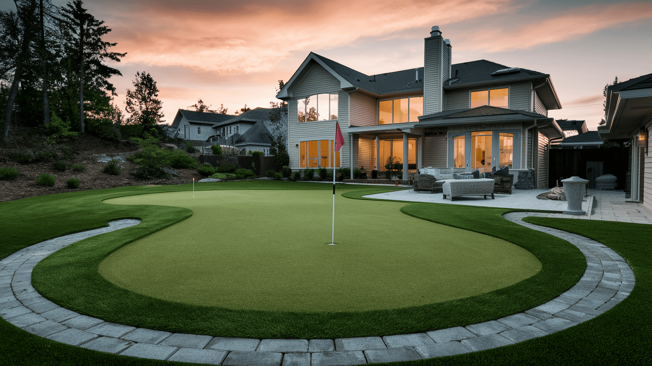 Turn your backyard into a golfer’s paradise by installing artificial turf in the shape of a putting green, complete with cups and flags. Use pavers to create borders, paths, or even a mini bunker area for an authentic golfing experience right at home.