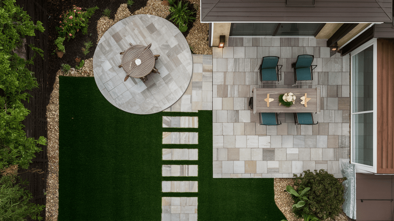 - Artfully combining artificial grass and pavers creates a low-maintenance, visually stunning backyard